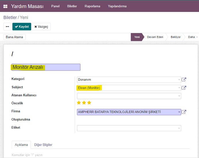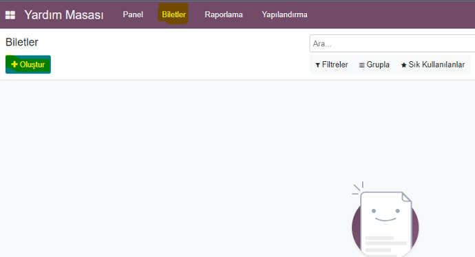 Yazılım, donanım ve ilişkili tüm konularda Odoo ana sayfasında "Yardım Masası" bağlantısını tıklayarak talep sürecini başlayabilirsiniz...